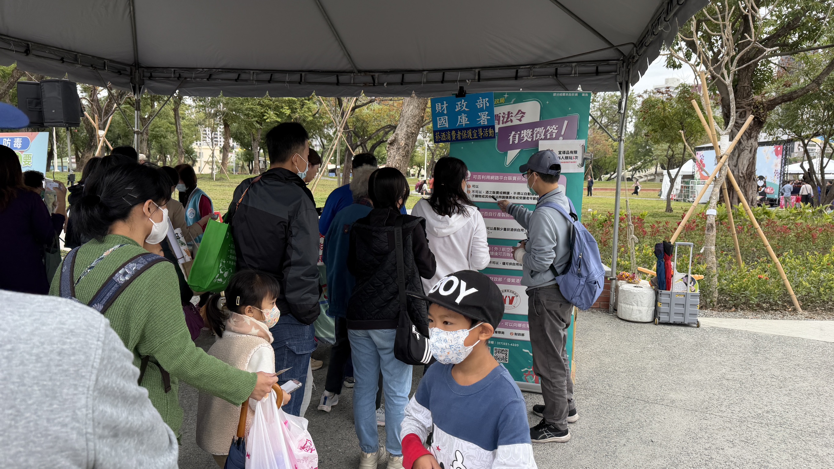 114年12月27日結合市府客委會舉辦之「盤花公園開園系列活動」辦理菸酒法令宣導,除於會場發放宣導摺頁外,更透過有獎徵答,吸引民眾主動學習菸酒法令,讓民眾觀園之餘,還能禮物、知識雙豐收!